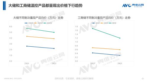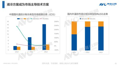 据奥维云网(AVC)调研,储能温控市场中液冷方案在2022年后占比快速提升,2023年出货产品基本上是以液冷为主,2024年Q1整体市场占比已超过80%,成为市场主导技术方案。有行业人士估计,2024年市场上源网侧大储风冷方案的温控产品将十不存一,只有部分工商储会用到一些小的风冷产品。