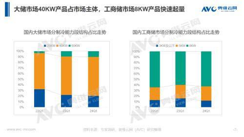 具体到产品制冷能力段来看,2024年Q1大储市场中温控产品以20kW以上大冷量产品为主,其中40kW占市场主体接近70%,同时2023年以来60kW的温控产品渗透率也在快速提升;而工商储市场中温控产品整体以10kW以下小冷量段产品为主,5kW产品在2022年前占据市场主体,8kW产品在2022年快速起量,当前市场占比已经超过60%。