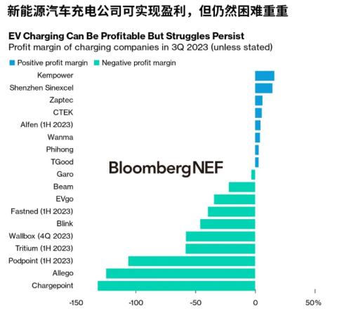 硬件供应商的盈利能力最强,优于运营商。快充制造商Kempower是彭博新能源财经跟踪的顶级公司之一,其2023年第三季度和第四季度的利润率分别为16%和6.4%。许多销售某个产品范围内新能源汽车充电桩的电力电子设备供应商也实现了盈利。