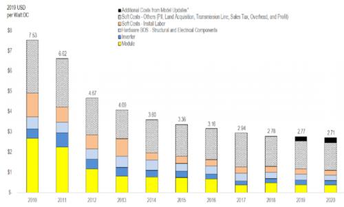 在2020年第一季度基准报告中,使用单晶硅太阳能发电组件而不是之前的多晶硅太阳能发电组件对系统进行建模,因为自从2016年以来美国市场转向使用更多的单晶硅太阳能发电组件。