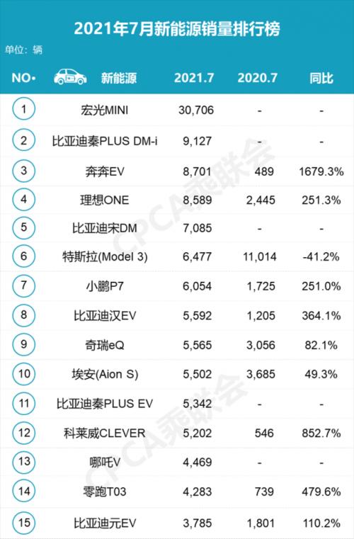 今年7月份新能源汽车排行榜略有波动,除了“屹立不倒”的五菱红光MINI EV依旧取得销冠外,特斯拉跌出前三,埃安品牌也没有保住前五,尽管7月特斯拉批发销量达32,968辆,同比增长199%,但从Model 3同比数据上看,当下的6,477辆同比去年的11,014辆,相差甚远。