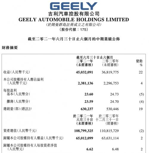 8月18日,吉利发布了半年财报。数据显示,2021年上半年,吉利汽车营收达450亿人民币,同比增长22%;扣除股份支付的股东应占溢利30.2亿人民币,同比增长31%,股东应占溢利23.8亿人民币,净利润24.1亿人民币。