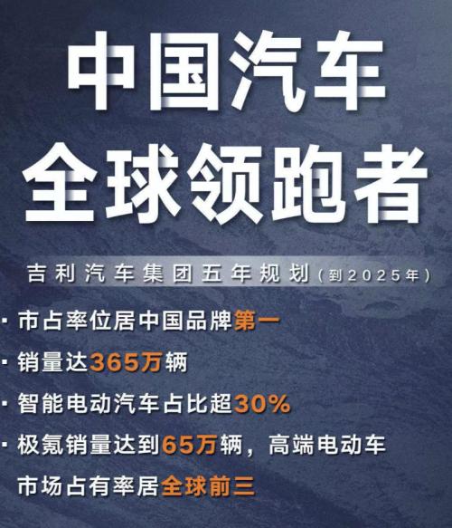 面对未来五年的市场变化,吉利制定了业务发展五年规划的纲要:到2025年,市场占有率位居中国品牌第一,销量达到365万辆(含极氪汽车),其中智能电动汽车占比超过30%。极氪汽车到2025年在高端电动汽车市场占有率居全球前三,销量达到65万辆。公司管理层将于近期对外解析五年规划具体内容。