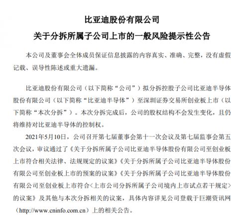重磅!比亚迪拟将比亚迪半导体分拆至创业板上市!