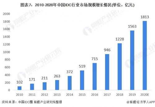 2019年,我国IDC市场规模已经突破了1500亿元。2020年,在“互联网+”的大背景下,海量数据的持续增长进一步推动IDC市场规模的增长,预计我国IDC市场规模达到1813亿元。