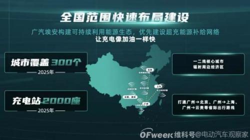 预计到2025年,广汽埃安将会在全国300个城市建设2000座超充站,渗透至地级市,实现全覆盖。
