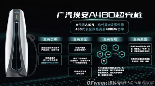 因此,广汽埃安也亲自打造高功率的超充桩,推出了A480超充桩。