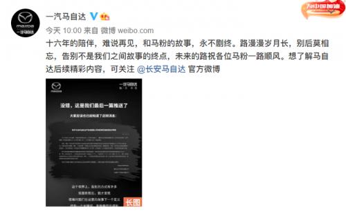 早在前几天,通过一汽马自达的官宣,我们可以听出它悲情的一面,其官宣标题《没错,这是我们最后一篇推送了》,一下把人带入到一种别离的情境中,“在这个世界上,告别的方式有许多,但直到现在,我才发现,很难对我们在这里的故事下一个定义,找到一个关键词,来做最后的道别,因为我们在一起,经历太多,一切的种种,都值得怀念……”。