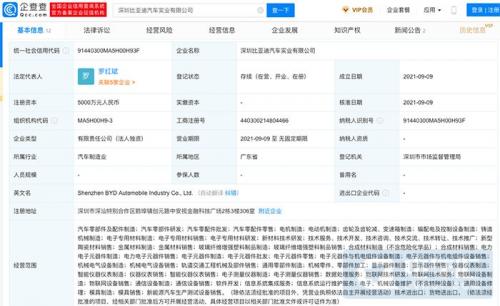 9月9日,企查查显示,深圳比亚迪汽车实业有限公司成立,注册资本5000万人民币,法定代表人为罗红斌,经营范围含汽车零部件及配件制造;新材料技术研发;电子元器件制造;物联网设备制造;新能源汽车生产测试设备销售等。