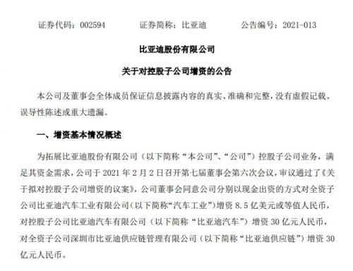 比亚迪(002594)2月2日晚间公告,公司拟分别以现金的方式对全资子公司比亚迪汽车工业有限公司增资8.5亿美元或等值人民币,对控股子公司比亚迪汽车有限公司增资30亿元人民币,对全资子公司深圳市比亚迪供应链管理有限公司增资30亿元人民币,上述增资金额将分别全额计入子公司注册资本。上述增资乃根据公司正常生产经营的需要,有利于子公司更好地发展其业务。