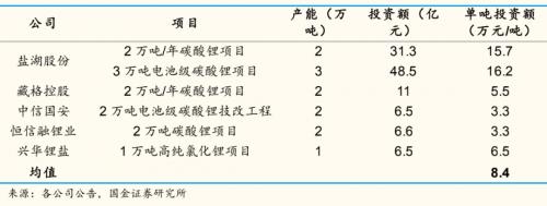 由于技术路线和资源禀赋差异,早期盐湖提锂产线投资水平差异较大,平均单吨投资额超过8万元/吨,盐湖股份产线甚至超过15万元/吨。同时产能爬坡时间长,保守估计产能释放最少要2-3年的周期。