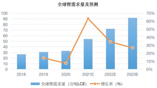 综合储能、新能源汽车、消费电子、传统应用领域的总体需求,预测到2023年全球锂需求量有望达到91.88万吨LCE,2021-2023年全球锂需求量复合年均增速为36%。