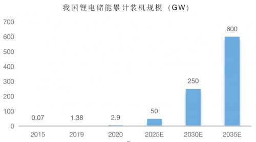 据《中国锂电储能发展战略展望》测算,预计到2025年,我国锂电储能累计装机规模将达到50GW,市场空间约2000亿元;到2035年,锂电储能累计装机规模有望达到600GW,市场空间约2万亿。