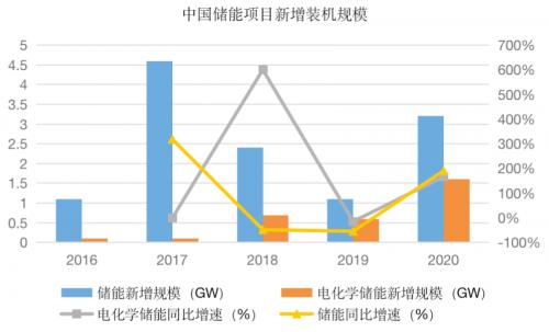 中国作为全球最大的新增电化学储能市场之一,2020年新增装机规模为1.56GW,占据全球电化学储能新增投运规模的33%。同比增长144.9%,占中国全部新增储能项目的48.8%。