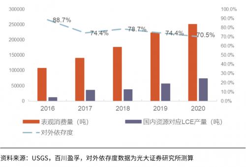 面对新能源汽车和储能爆发,锂资源需求快速增长带来的巨大供需缺口,其战略重要性已基本成为全球共识。目前中国锂盐上游原材料(盐湖或矿石)主要源于澳洲和智利进口,同时也是碳酸锂产品的主要净进口国,2020年对外依存度超过70%。