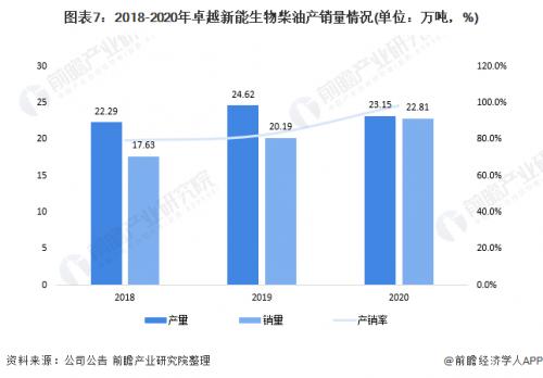 从生物柴油产销量来看,2018年以来,卓越新能生物柴油产销量均总体增长,产销率也不断提升。2020年,公司生物柴油的产量、销量分别为23.15万吨、22.81万吨,产销率达98.5%