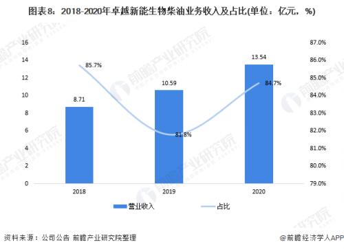 从经营规模来看,生物柴油收入规模来看,2018-2020年,卓越新能生物柴油业务收入不断增长,业务占比维持在80%以上。