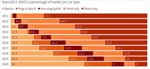 近日,据挪威公路联合会(OFV)周二发布的数据,2020年该国电动车销量占全市场比例达到54.3%,成为全世界首个全年电动车销量占比过半的国家。