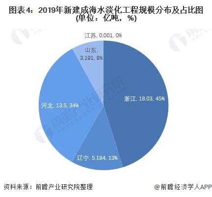 2019年我国新建海水淡化工程规模分布以华东地区、华北地区的沿海城市为主。其中浙江省海水淡化新建规模产能为18.03亿吨,占我国海水淡化新建产能的45%,同时2019年浙江省海水淡化工程规模为40.78万吨/日,是我国海水淡化行业发展最主要的城市。