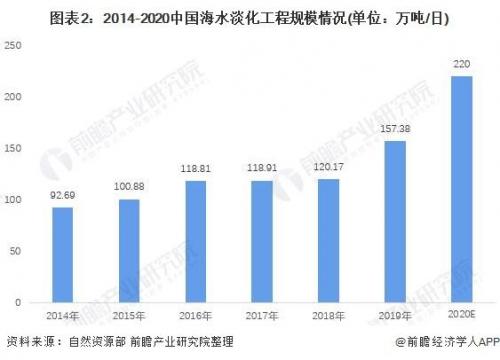 2020年我国在海水淡化、海水直接利用等海水利用关键技术方面取得重大突破,技术经济日趋合理。部分技术如低温多效海水淡化技术、海水循环冷却技术已跻身国际先进水平。技术的进步促进了我国海水淡化工程规模的发展,根据“十三五”规划关于海水淡化的目标前瞻预计2020年我国海水淡化工程规模在220万吨/日左右。