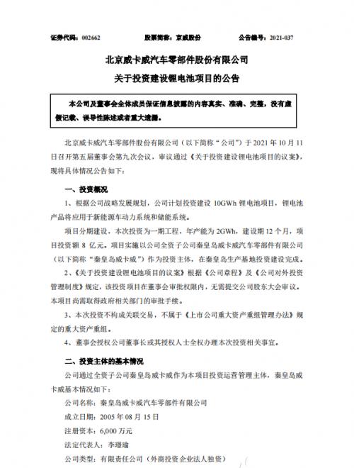 世纪储能网消息:10月11日,京威股份发布《关于投资建设锂电池项目的公告》。