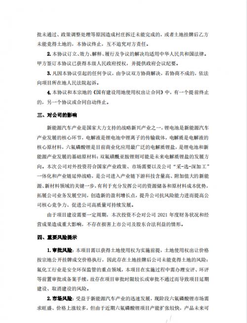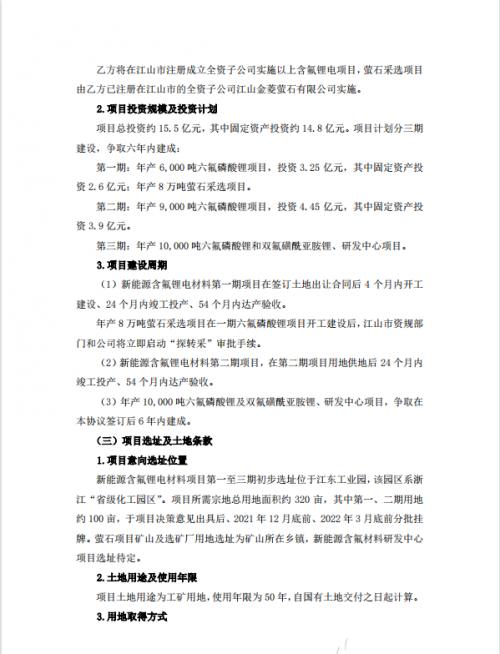 项目分三期建设,争取6年内建成:第一期为年产6000吨六氟磷酸锂项目和年产8万吨萤石精矿产品采选项目;第二期为年产9,000吨六氟磷酸锂项目;第三期计划为年产10,000吨六氟磷酸锂和双氟磺酰亚胺锂、研发中心项目。