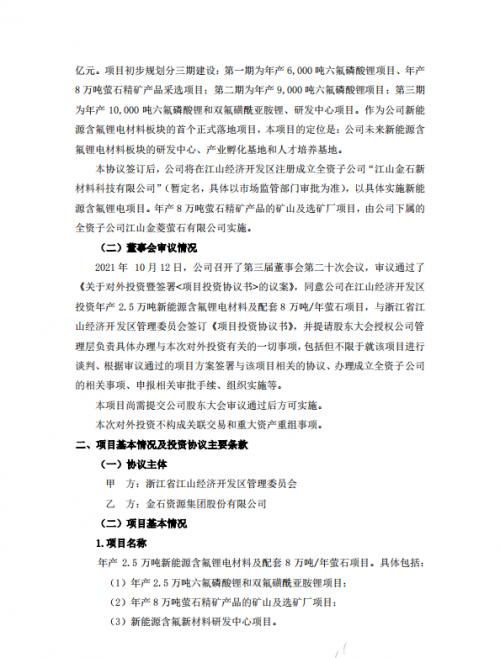 本协议签订后,金石资源将在江山经济开发区注册成立全资子公司“江山金石新材料科技有限公司”,以具体实施新能源含氟锂电项目。萤石项目由公司全资子公司金菱萤石实施。