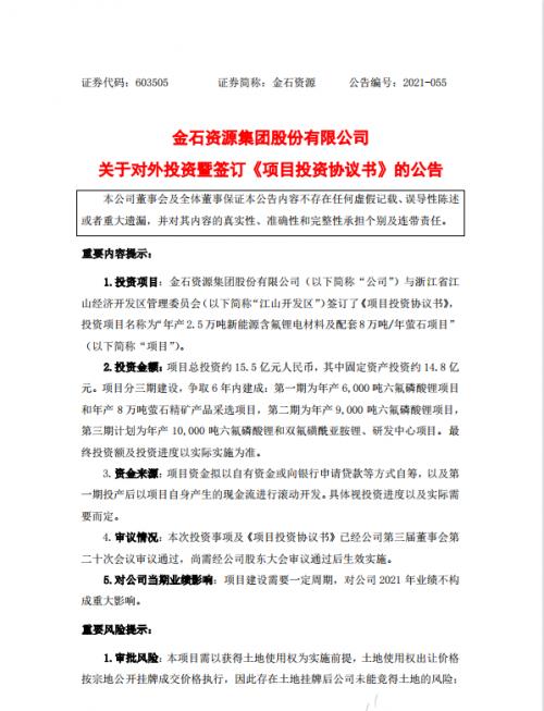 世纪储能网消息:10月13日,金石资源公告,公司与浙江省江山经济开发区管理委员会签订了《项目投资协议书》,投资建设年产2.5万吨新能源含氟锂电材料及配套8万吨/年萤石项目,项目总投资约15.5亿元。