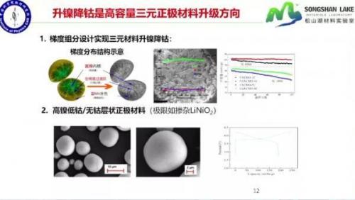 黄学杰提到的第二条降钴路线是升镍。为了提高容量,把镍的容量增加,正极材料的能量可以从160mAh/g提高到180mAh/g,进而继续提升到200mAh/g。