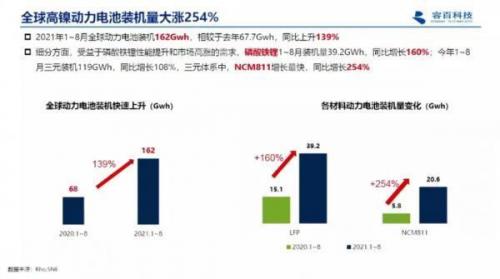 佘圣贤给出了一组数据,今年1―8月份,全球总体来说电池快速增长这里面有两块相对细分市场值得关注,磷酸铁锂增加了160%,三元材料领域的811增速更快,达到250%以上。