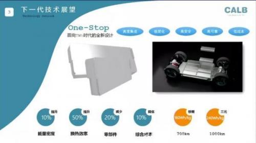 谢秋介绍说,One-Stop可以在体系不变的前提下,能量密度大概能提升10%,包含零部件可以减少20%。在相同的空间内,可以由三元变成铁锂,因为体积能量密度更高,铁锂支持700公里,电池包的能量密度能做到160Wh/kg;做三元的话,里程能支撑1000公里,电池包的能量密度达到240GWh/kg。