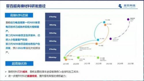 容百方面,第一代Ni83体系的电芯技术已经成熟并大规模应用;第二代Ni90体系正在开发,已经进入小批量阶段;第三代Ni96体系正在和客户开发,预计2022年实现大规模量产。