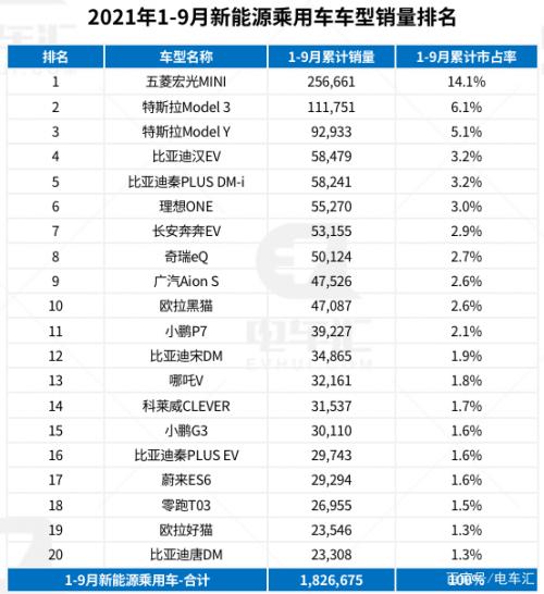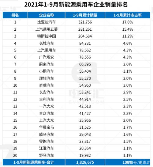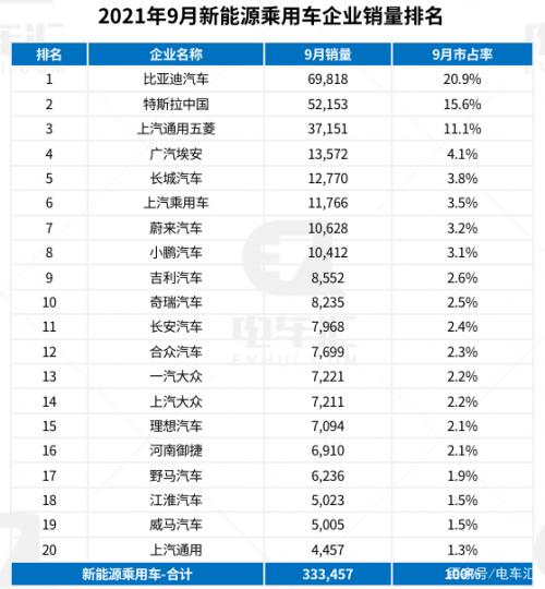 在企业销量中,比亚迪以69818辆的优势蝉联榜首,同时在前三季度的累计销量中,比亚迪以领先上通五菱近3万辆的优势位列第一。特斯拉9月份销量52153辆,位列第二名,相较于8月份的国内销量12885辆,9月大幅增长。上通五菱9月份销量环比出现下滑,位列第三。