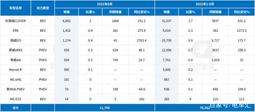 上汽乘用车销量11766辆,环比微涨,排名第六。从车型销量来看,上汽乘用车主要依靠微型车科莱威CLEVER销量带动,ER6等车型9月份销量并不亮眼。