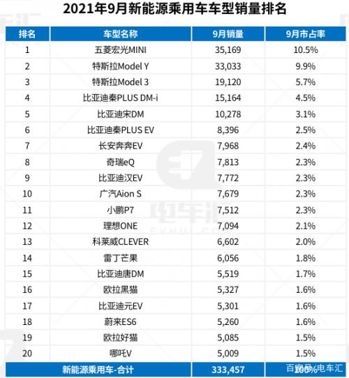 从车型销量来看,五菱宏光miniEV仍然新能源车型销量榜第一名,不过很明显,在特斯拉Model Y启动大规模交付后,9月份Model Y的销量达到了33033辆,比亚迪凭借多款畅销车型占据车型榜单多个位置,这也造就了比亚迪总销量第一名的地位。