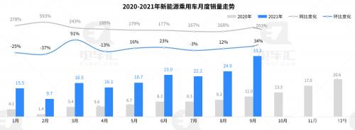 电车汇消息:近日,乘联会对外发布了9月份的新能源乘用车销量情况,数据显示,9月新能源乘用车零售销量达到33.3万辆,同比增长203%,环比增34%;1-8月新能源车零售181.8万辆,累计同比增长203%。