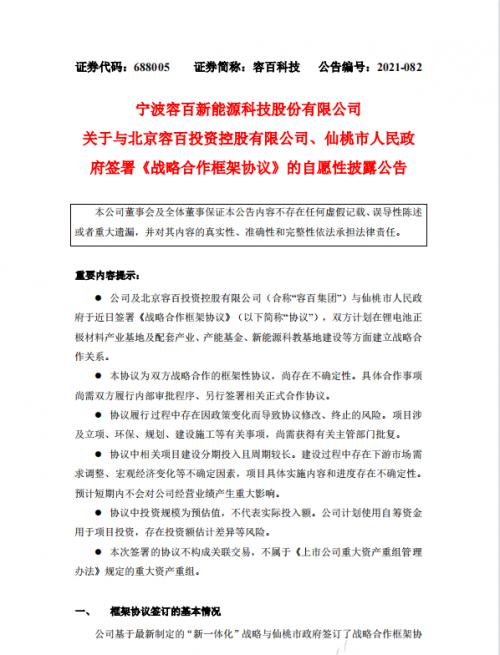 世纪储能网消息:10月19日,三元材料龙头企业容百科技发布公告称,公司基于最新制定的“新一体化”战略与仙桃市政府签订了战略合作框架协议。
