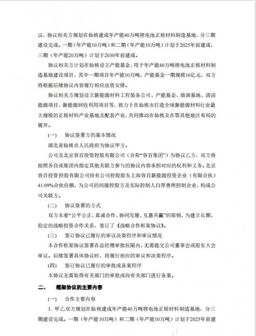此外,协议相关方计划在仙桃设立产能基金,用于年产能40万吨锂电池正极材料制造基地建设项目,其中一期项目年产能10万吨,产能基金一期规模16亿元,双方将根据后续协议内容履行相应出资安排。