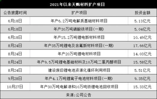 尽管想法可能是好的,但2019年,天赐材料净利润0.18亿,同比下降96%。利润大幅下滑的主要原因便是,选矿业务的相关产品市场价格下行,年末计提较大金额存货跌价准备;正极材料价格下行,产能未完全释放,年度出现较大程度亏损。天风证券研报中称此为“走太快而犯过错”。2019年天赐材料清理拖累业务,重新聚焦电解液和日化后,毛利率逐渐回升,2019年和2020年,公司毛利率分别为25.64%、34.97%。2021年,受国内新能源车的快速发展及供需失衡的影响,天赐材料毛利率提高到38.96%。与此同时,公司不断扩大产能以满足未来的需求。