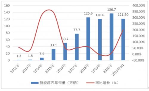 导读:从数据上来看,2021年上半年中国实现汽车销量1256.9万辆,同比增长24.2%,为近十年的最高水平,其中新能源汽车销量为121.50万辆,同比增长200.6%,这是自2014-2015年间由于高额补贴而导致整体行业迅猛发展之后迎来的新一轮快速增长。总体来看,新能源汽车行业已经逐渐体现其行业优势,正在向着万亿级市场快速前行。