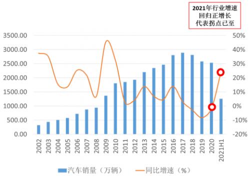 反观我国汽车行业的发展,随着我国汽车销量逐渐趋于饱和,在2011-2020年间呈现出了明显的增速波动变化。从增速来看,2019年为增速的最低谷时期,2020年由于疫情原因致使整体行业回暖速度减慢,导致2020年整体行业增速仍为负增长。2021年随着疫情逐步得到控制,汽车行业迎来了触底反弹,2021年上半年中国实现汽车销量1256.9万辆,同比增长24.2%,为近十年的最高水平。