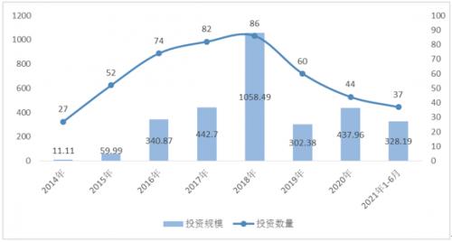 图4:2014-2021年上半年中国新能源汽车行业投融资事件数量及规模(单位:起,亿人民币)