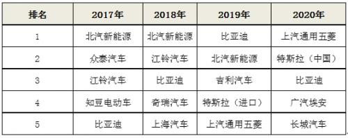 国内纯电动车市场,销量排名前十的企业市占率维持在75%左右变动,但从前五名的排名来看,2017年和2018年市占率前五的车企在2020年全部跌出前五名。其中北汽新能源从2017年和2018年市占率第一,2019年下滑至市占率第二,到2020年跌至第六名。与此相反的是上汽通用五菱凭借宏光MINI EV以不到4万元的销售价格一举攀上全国纯电动车的榜首。而特斯拉(中国)凭借上海工厂的建成,成为国内市占率第二的纯电动车制造商;比亚迪通过不断推出新车型满足国内市场需求,连续三年排名市场前三。