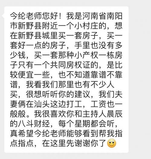昨天,有一位喜马拉雅节目“八斗财经”的听众在我的微信视频号“今纶财经”私信留言,表示想在河南省南阳市新野县买一套房子,而他们夫妻俩是在汕头这边打工的: