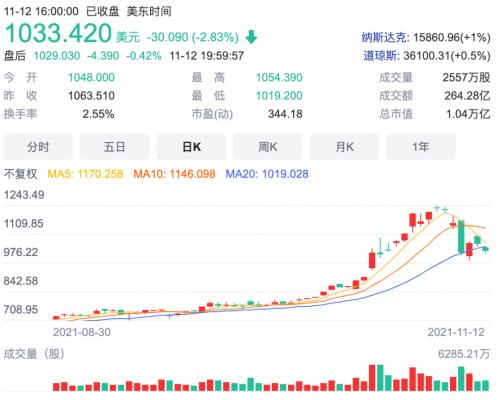 截至11月12日收盘,特斯拉股价报收1033.42美元,距离近期股价最高点1243.49美元,短短一周时间已经暴跌了17%。