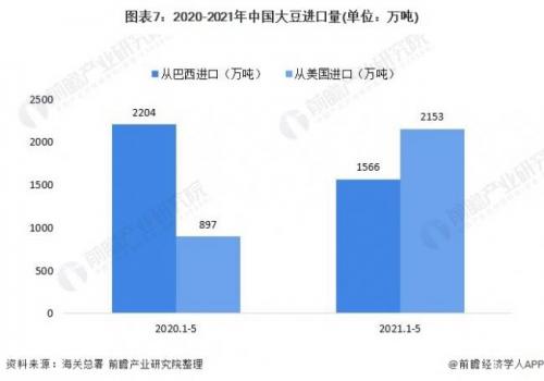 巴西干旱导致的运输受限使得我国从巴西进口的大豆数量有所减少,从美国进口的大豆数量大幅增长。据海关总署公布数据,2021年1-5月,中国从巴西进口了1566万吨大豆,同比下降29%;从美国进口了2153万吨大豆,同比上升240%。