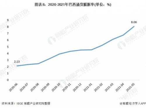 据巴西国家地理与统计局(IBGE)公布数据,2021年5月,巴西的通货膨胀率激增8.06%,是该国央行通胀目标3.75%的两倍多,创近五年来最大涨幅。