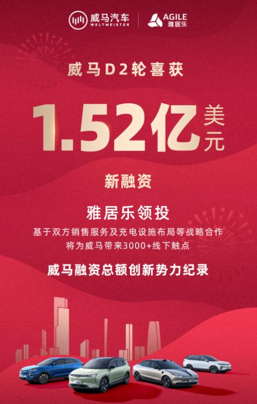 12月1日,威马公布D2轮融资进展,获得了1.52亿美元最新融资。其中领投方为中国知名高端房地产企业――雅居乐集团,跟投者包括锦V商汇等。