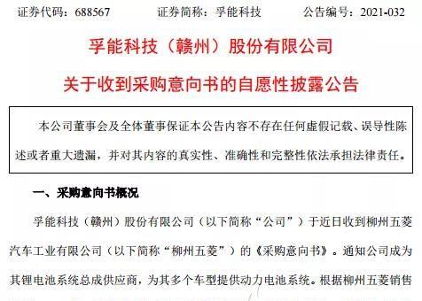 6月29日,孚能科技(688567.SH)发布关于收到采购意向书的自愿性披露公告。