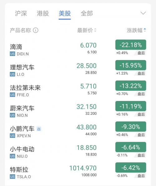 恐慌情绪被放大,进一步表现在股价上,就不仅仅是滴滴一家遭遇了暴跌,哪怕是热门的新势力们,也同时受到了暴击:蔚来下跌了11.19%,小鹏下跌了9.30%,理想更惨,下跌了15.95%。